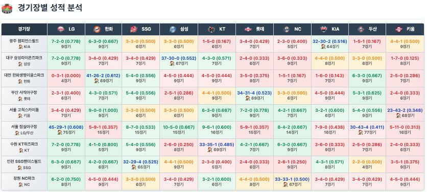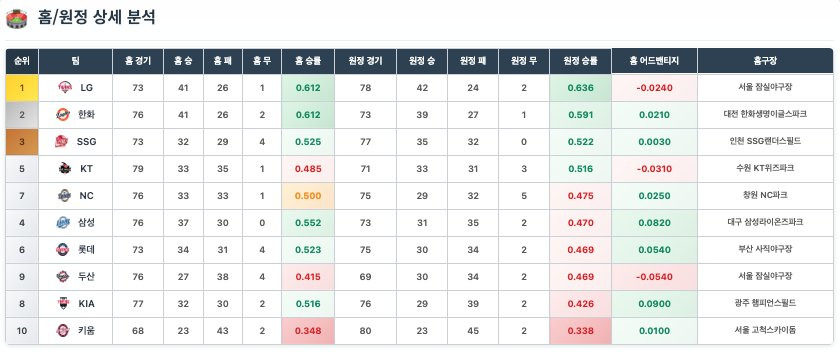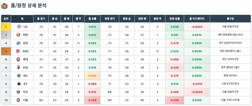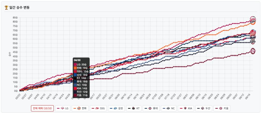 KBO 2025 실시간 순위표와 20개 분석지표! 매직넘버 계산기, 일자별 순위 그래프, 시즌진행률, 순위변동, 전후반기, 피타고리안, 클러치지수, 홈원정, 상대전적, 월별주차별요일별경기장별 성적까
