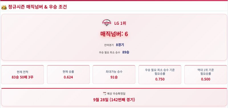KBO 매직넘버 계산기 2025: https://m.site.naver.com/1NAFH