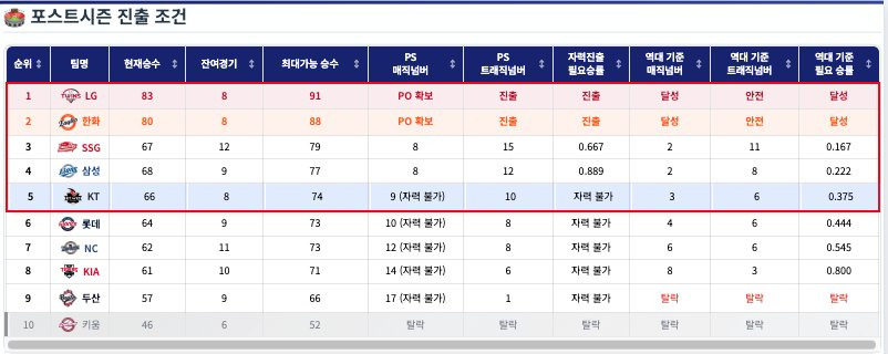 #KBO매직넘버계산기 #엘지트윈스매직넘버 #KBO포스트시즌경쟁 #삼성라이온즈4위등극 #KT4연패